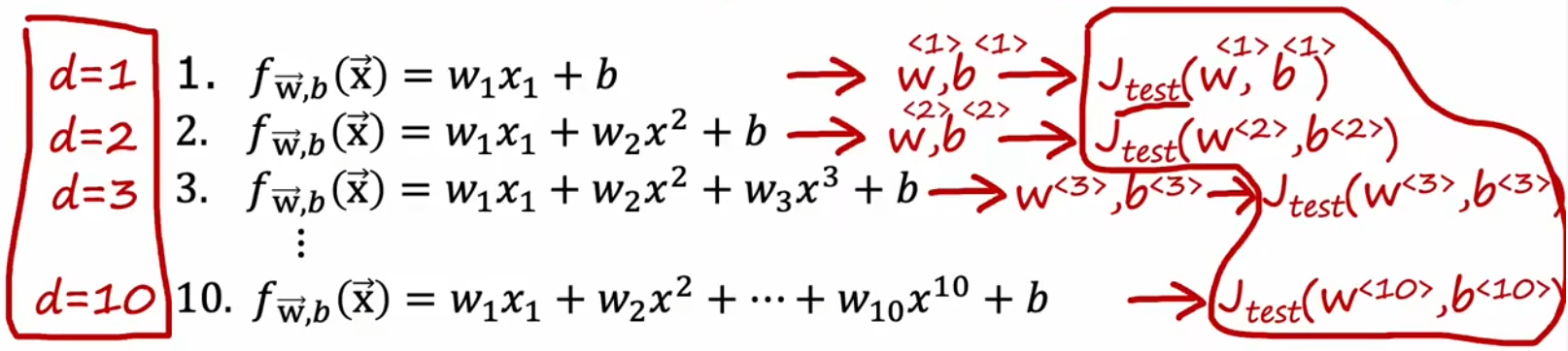 - 交叉验证集:用于计算验证误差模型的选择,并利用其选择合适的模型整体参数,比如“房价预测问题”中的多项式次数、神经网络的层数/神经元数量、模型的正则化参数等。