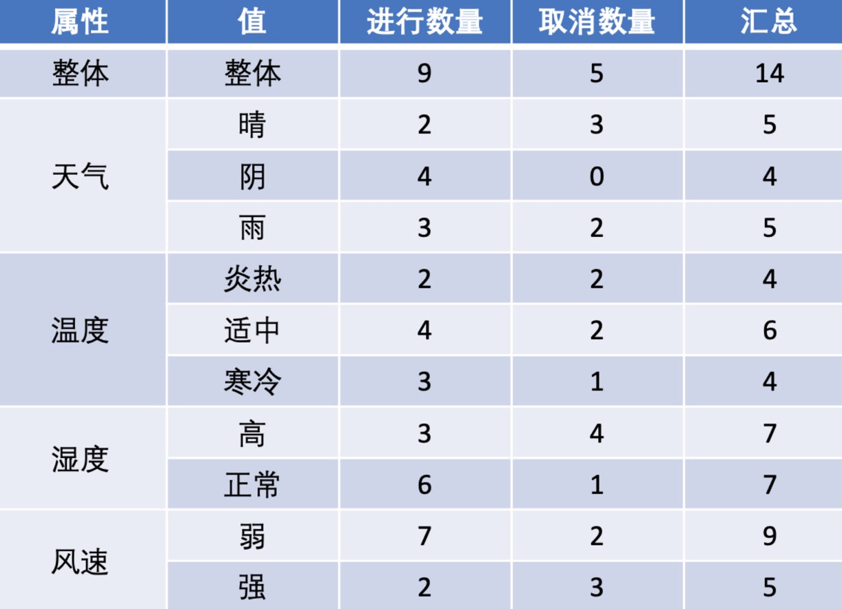 该数据集有四个属性,属性集合 A={ 天气,温度,湿度,风速}, 类别标签有两个,类别集合 L={进行,取消}。